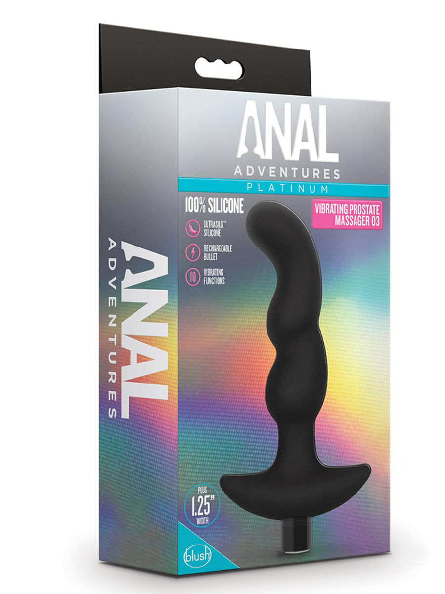 Nov i potpuno osvežavajući artikal, za sve ljubitelje masažera za prostatu. I za zdravlje i za zadovoljstvo! Anal Adventures Platinum Vibracioni masažer za prostatu 03 je najbolji poklon za vas ili vašeg partnera. Za sve koji žele da istraže nove analne orgazme sami ili sa partnerom. Osetite zadovoljstvo, upotreba je veoma udobna, dizajn je razuman, lako se ubacuje. Pruža optimalnu stimulaciju i udobnost nošenja. Talasaste krivine ovog masažera dodaju dodatnu stimulaciju i dolazi opremljen punjivim metkom velike snage sa 10 funkcija.Radi većeg uzitka preporučujemo korišćenje lubrikanta na vodenoj bazi koje takodje možete naći kod nas u radnjama. Održavanje isključivo mlaka voda i sapun.