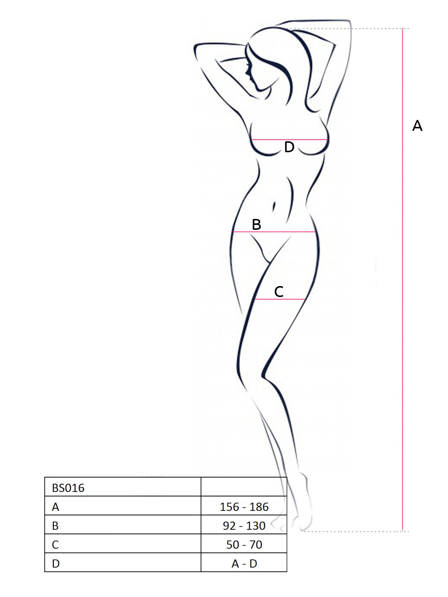Ovaj visokokvalitetni bodystocking dostupan je u jednoj univerzalnoj veličini. Izrađen je od visokokvalitetnih materijala – 80% poliamid i 20% elastina, obezbeđujući udobnost i rastegljivost koja omogućava da se savršeno prilagodi vašem telu. Univerzalna veličina S-L garantuje da će se savršeno pristajati na svaku figuru.