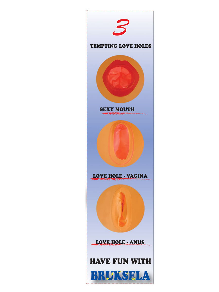 Prelepa seksi lutka na naduvavanje sa šarmantnim 3 D licem i stojećom pozom koja iskušava i izaziva. U prirodnoj je veličini. Njene ogromne grudi će probuditi sva vaša čula, kao i 3 vrlo uska otvora vagina.usta i anal.Koristi se sa vodenim lubrikantom a održava pomoću mlake vode i sapuna.