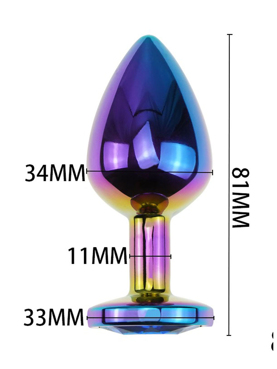 Metalni butt plug napravljen od metala (bez nikla) sa kristalom u duginim bojama na dnu je ergonomskog dizajna i idealan kako za početnike tako i za one iskusnije. Zbog svog konusnog oblika će uvek stajati na mestu. Radi lakše penetracije i lepšeg iskustva preporučujemo upotrebu lubrikanta na bazi vode koji takodje možete naći kod nas u prodaji. Nakon upotrebe je bitno samo isprati ga sa toplom vodom i sapunicom.