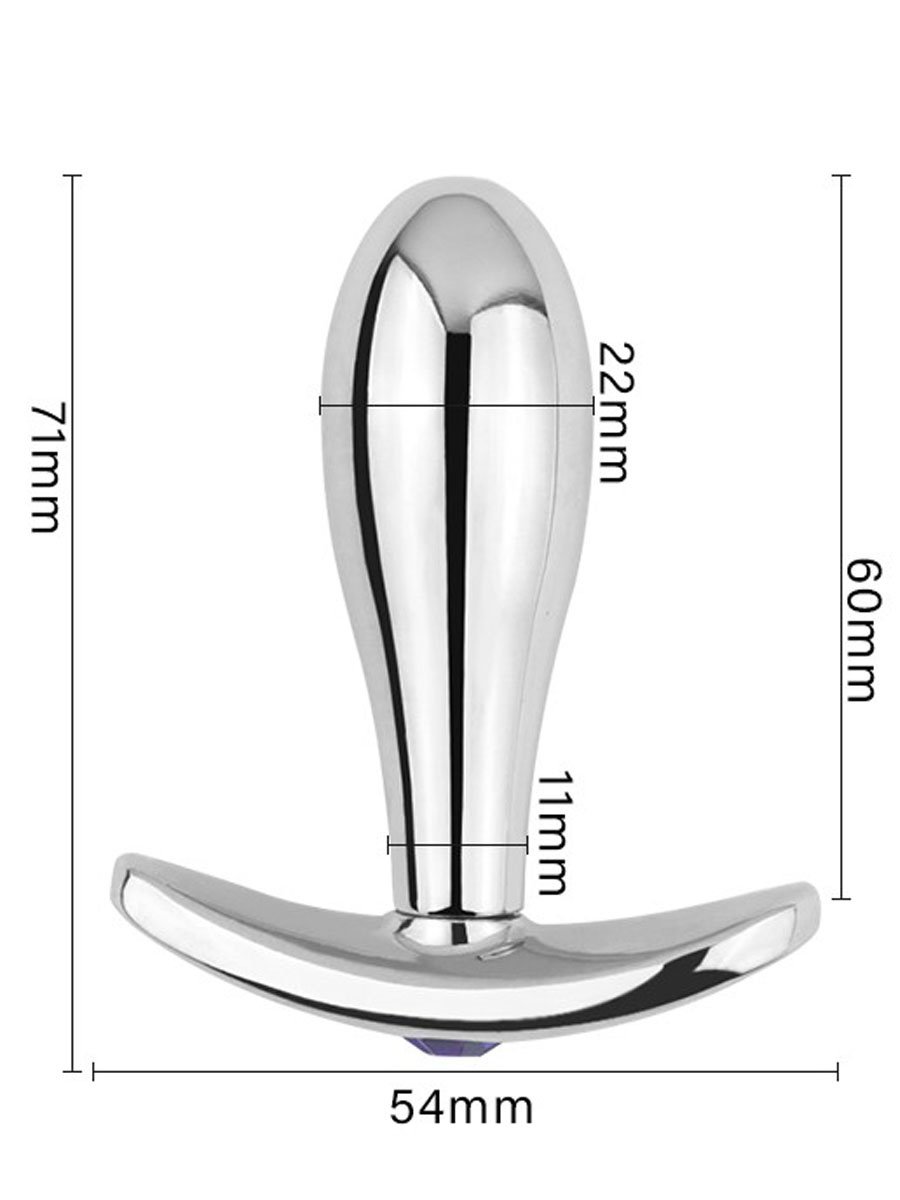 Metalni plug sa ukrasnim kamenom na dnu,veoma gladak tako da u kombinaciji sa lubrikantom sve ide veoma lako i bez napora.Ukupna dužina je 7cm dok je penetrirajući deo 6cm,prečnik na vrhu je 2,2cm.Veoma lako se održava,prati običnom vodom i sapunicom i po mogućstvu koristite lubrikante na vodenoj bazi.