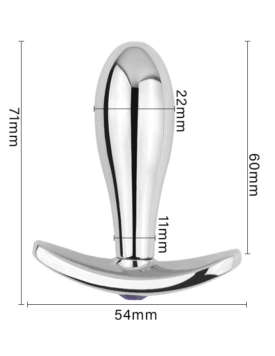 Metalni plug sa ukrasnim kamenom na dnu,veoma gladak tako da u kombinaciji sa lubrikantom sve ide veoma lako i bez napora.Ukupna dužina je 7cm dok je penetrirajući deo 6cm,prečnik na vrhu je 2,2cm.Veoma lako se održava,prati običnom vodom i sapunicom i po mogućstvu koristite lubrikante na vodenoj bazi.