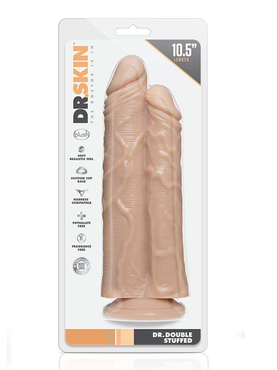 Dr. Skin Double Stuffed će vas naterati da verujete da su dva bolja od jednog. Double Trouble je izvajan tako da uključuje sve vene, grebene i teksturu kože pravog penisa -puta dva! Napravljen od neporoznog PVC-a,ne sadrži ftalate. Radi većeg užitka i lakše penetracije preporučujemo upotrebu lubriikanta na bazi vode koji takodje možete naći kod nas u prodaji. Održava se pomoću tople vode i sapunice. Veličina 26.6 cm. Deo za penetraciju 24.1 cm. Širina 8.2cm.