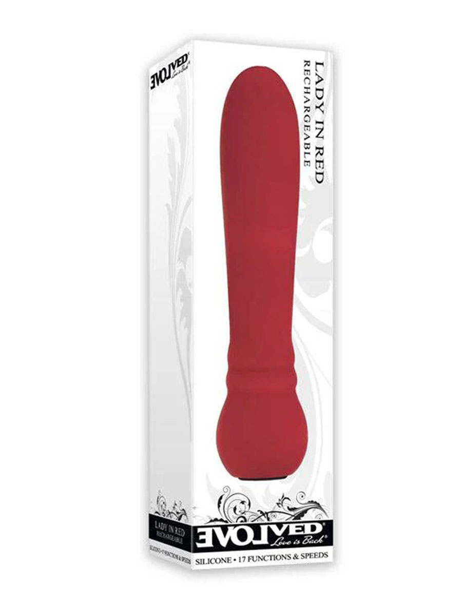 Vibrator „Lady In Red Bullet“ od Evolved Novelties. Lady In Red, upoznajte svoj novi omiljeni vibrator! Napravljen od luksuznog silikona sa fleksibilnom osovinom, ovaj mali, ali moćan vibrator sa 17 funkcija se savija prema vašim željama! Njegov klasični oblik blago se nadima prema vrhu, a jednostavna kontrola jednim dugmetom je praktično smeštena na dnu dugmaste drške koja ima suptilna rebra u osnovi za dodatni hvat. Ovaj vibrator voli igru u vodi, jer je potpuno vodootporan. Čisti se  pomoću sredstva za čišćenje igračaka  ili ispiranja toplom vodom i sapunicom. Karakteristike: moćan silikonski vibrator sa više brzina. Fleksibilno telo vibratora koje se savija. 17 različitih funkcija i brzina. Jednostavna kontrola jednim dugmetom. Napravljen od luksuznog silikona. Veličina: visina 11,7 cm, širina 1,2 cm. Težina: 60 ​​grama. Vodootporne vibracije, potpuno potopljiv. Potpuno punjiv, USB kabl je uključen.