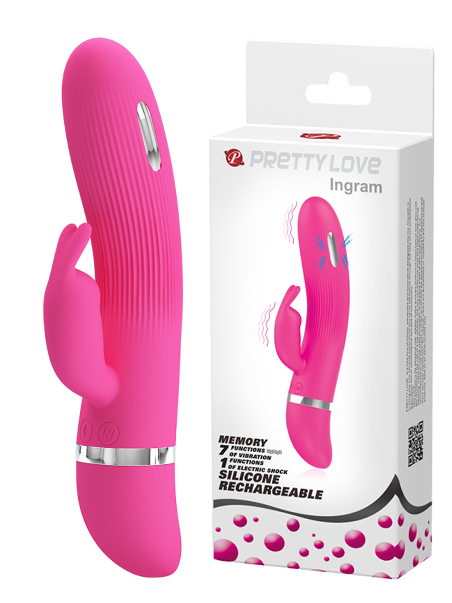 Ingram vibrator na baterije sa elektrošokom. Izrađen od visokokvalitetnog materijala, modernog dizajna sa stimulacijom za klitoris u vidu vibro zeke i elektro šokom da dodatno začinite vašu vrelu akciju. Ukupne dužine od 19 cm a deo za penetraciju 11cm i prečnika od 3,5 cm. Poseduje 7 modova vibracija koje pokreću 2 AAA baterije. Kako biste olakšali penetraciju preporučujemo upotrebu lubrikanta na vodenoj bazi. Za pravilno održavanje potrebno je igračku oprati toplom vodom i antibakterijskim sapunom.