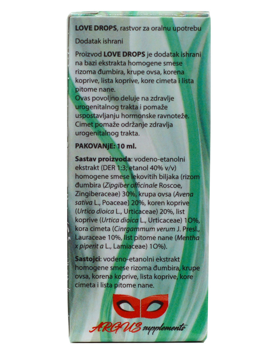 Ako ste umorni i niste raspoloženi za seksualni odnos, ne brinite,tu je naš novi proizvod koji će Vam pomoći da se seksualnost i libido pojačaju. LOVE DROPS utiče na oba pola,kako muškarce tako i žene. Utiče na regulisanje hormonske ravnoteže i muškarca i žene, kako testosterona kod muškaraca tako i estrogena kod žena. LOVE DROPS je dodatak ishrani na bazi ekstrakta homogene smese rizoma djumbira, krupe ovsa, korena koprive, lista koprive, kore cimeta i lista pitome nane. Ovas povoljno utiče na zdravlje urogenitalnog trakta i pomaže uspostavljanju hormonske ravnoteže. Cimet pomaže održanje zdravlja urogenitalnog trakta.