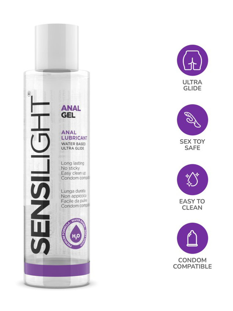 Sensilight Analgel 150ml je intimni lubrikant na bazi vode, posebno formulisan za analnu hidrataciju i podmazivanje pre seksualnog odnosa.Zahvaljujući svojoj ekskluzivnoj formulaciji bogatoj dragocenim prirodnim aktivnim elementima. Sensilight Analgel sprečava osećaj nelagodnosti, peckanja i iritacije koji mogu uticati na intimne delove tela. Garantuje dugotrajan i prijatan efekat podmazivanja. Takođe se može primenjivati na sve seks igračke.Za razliku od drugih lubrikanata na bazi vode, ima konzistenciju i viskoznost sličnu proizvodima na bazi silikona, a istovremeno zadržava sve prednosti lubrikanata na bazi vode. Lubrikant na bazi vode ne ostavlja masnoću ili mrlje i lako se ispira zahvaljujući neutralnoj formuli koja ne sadrži masti ili iritantne supstance.Lubrikant na bazi vode je bezbedan za upotrebu sa kondomima tokom vaginalnog ili analnog seksa.
