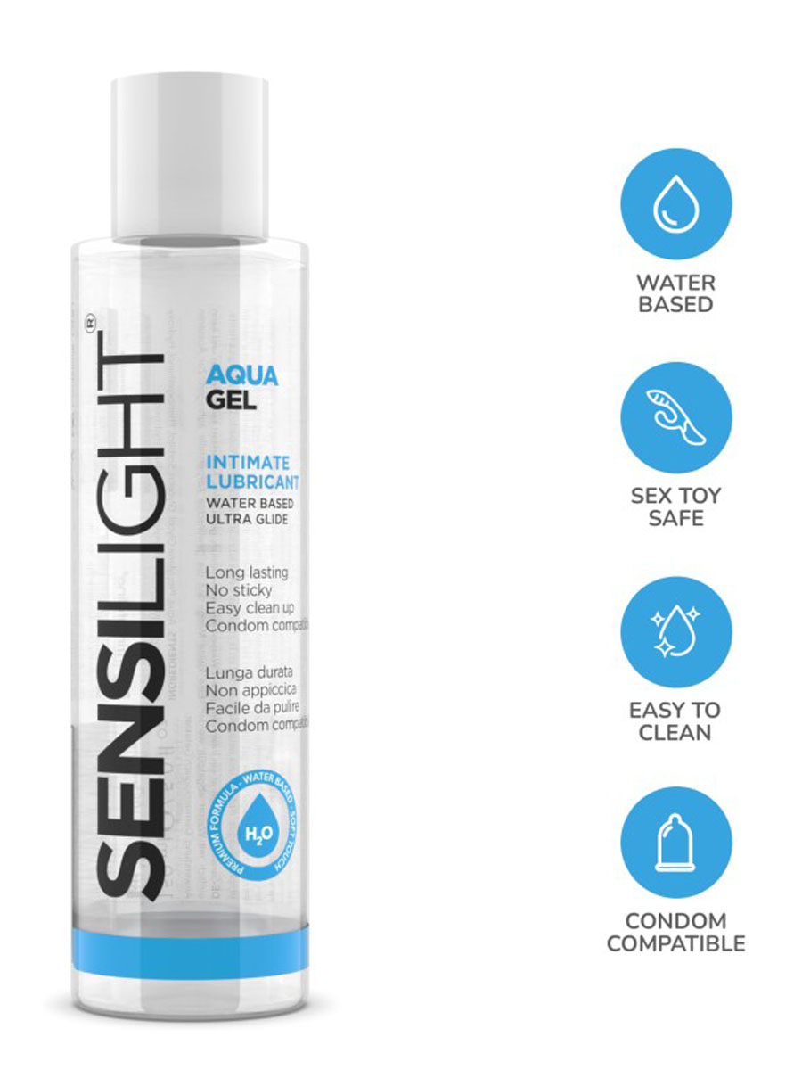 Sensilight Aquagel, 150ml je intimni lubrikant na bazi vode, posebno formulisan za vaginalnu hidrataciju i podmazivanje pre seksualnog odnosa. Preporučuju se i za vaginalni i za analni seks, u skladu sa svojom specifičnom formulacijom. Garantuje dugotrajan i prijatan efekat podmazivanja. Takođe se može primenjivati na sve seks igračke. Lubrikant na bazi vode ne ostavlja masnoću ili mrlje i lako se ispira zahvaljujući neutralnoj formuli koja ne sadrži masti ili iritantne supstance.Lubrikant na bazi vode je bezbedan za upotrebu sa kondomima tokom vaginalnog ili analnog seksa.