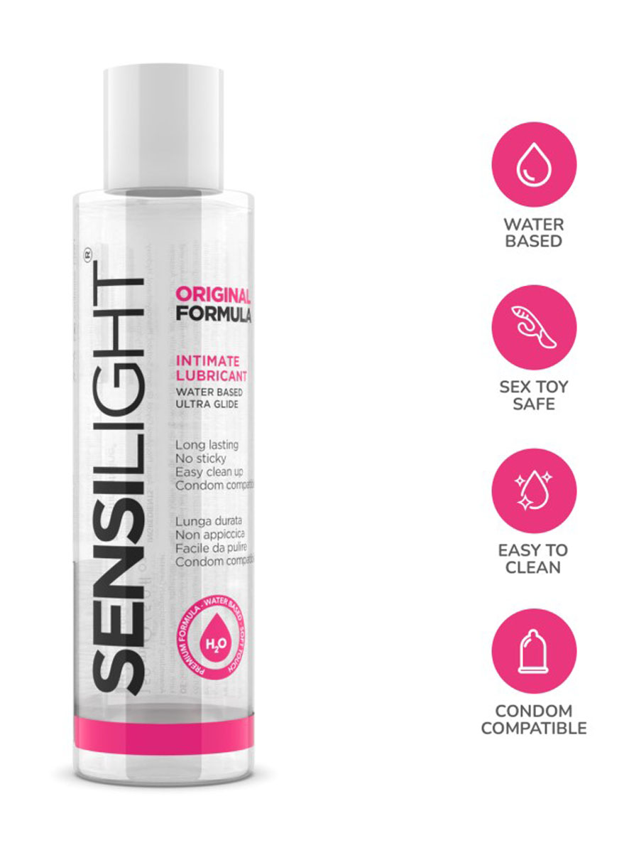 Sensilight Original Formula, 150ml je intimni lubrikant na bazi vode, sa efektom podmazivanja i hidratacije. Namenjen je za upotrebu u intimnim delovima tela, formulisan je da olakša seksualni odnos u slučaju nedovoljnog prirodnog podmazivanja. Nežna formula Sensilight Original Formula klizi po koži kako bi sprečila bilo kakvu nelagodnost ili peckanje. Njegova posebna formula čini ga savršenim za vaginalni seks, jer ima maksimalnu kompatibilnost sa sluzokožom.Garantuje dugotrajan i prijatan efekat podmazivanja. Takođe se može primenjivati na sve seks igračke. Lubrikant na bazi vode ne ostavlja masnoću ili mrlje i lako se ispira zahvaljujući neutralnoj formuli koja ne sadrži masti ili iritantne supstance.Lubrikant na bazi vode je bezbedan za upotrebu sa kondomima tokom vaginalnog ili analnog seksa.