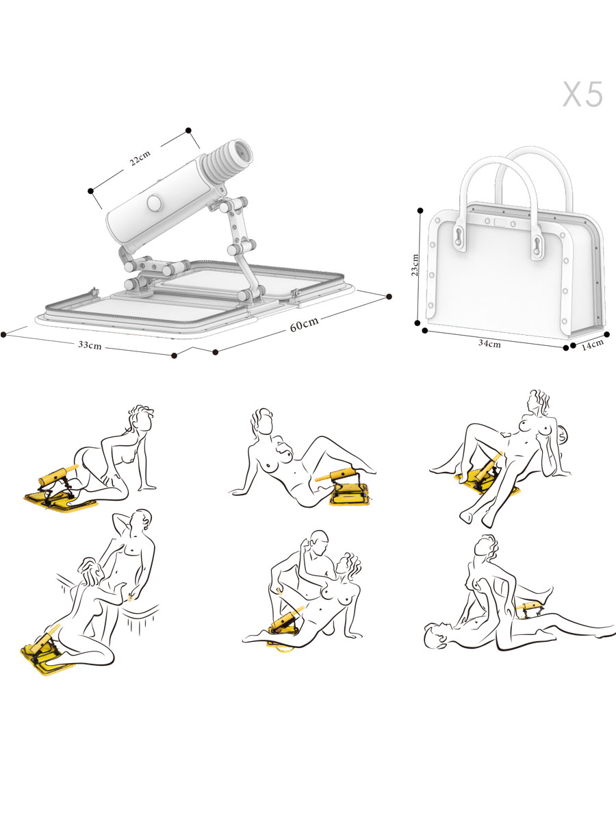 Sex mašina X5 namenjena je korisnicima koji žele automatsku stimulaciju i praktičniju upotrebu bez ruku. Model dolazi u elegantnom pakovanju koje se, uz pomoć dve ručke iz kutije, može pretvoriti u torbu za lakše nošenje i odlaganje.