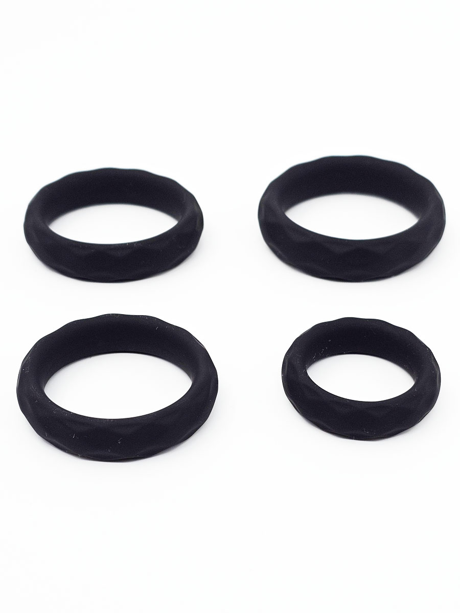 Set od četiri silikonska prstena koji imaju blagu teksturu koja ni malo ne smeta prilikom korišćenja ali pomaže da ne skliznu sa korena baš lako.Od četiri različite dimenzije veoma lako će te naći baš onu koja Vam odgovara a povrh toga su veoma rastegljivi i mekani.Koriste se tako što se postave na koren penisa i sprečavaju nagli povrat krvi i tako produžavaju erekciju.Odlične rezultate daju ako se koriste sa bilo vakum ili vodenim pumpama koje dovode do erekcije.
