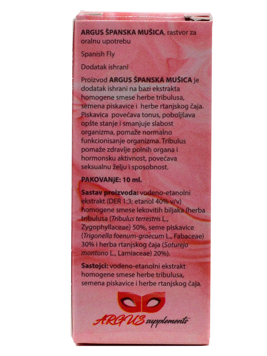 Ako želite da probate nešto novo i da pospešite Vaš seksualni odnos probajte ovaj naš novi proizvod na prirodnoj bazi sa akcentom na probranim potpuno prirodnim sastojcima. Španska mušica je dodatak ishrani na bazi ekstrakta homogene smese herbe tribulusa, semena piskavice i herbe rtnjaskog čaja. Piskavica povećava tonus, poboljšava opšte stanje i smanjuje slabost organizma. Tribulus pomaže zdravlje polnih organa i hormonsku aktivnost, povećava seksualnu želju i sposobnost.