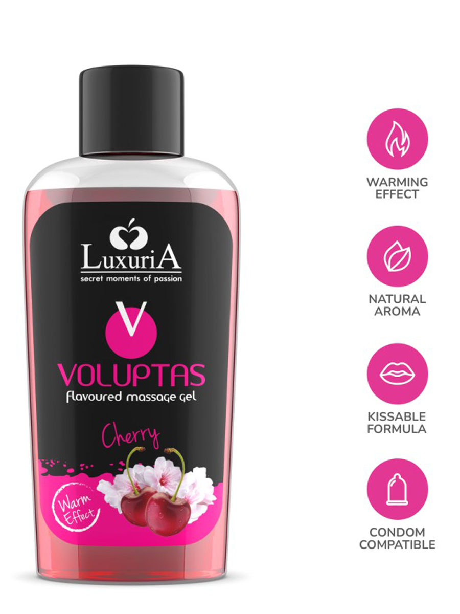 Voluptas Cherry je zavodljiv i ukusan stimulativni gel sa zadivljujućim i senzualnim ukusom koji kombinuje izuzenu hidrataciju sa regenerativnim i omekšavajućim svojstvima prirodnih ekstrakata izuzetnih aromatičnih esencija. Ukusan i provokativan, savršen je za one trenutke kada želite alternativne intimne ukuse. Ovaj gel će zagolicati vašu maštu i dodati dašak ukusa tokom vaših najintimnijih susreta. Voluptas cherry gel sa efektom zagrevanja je bezbedan za upotrebu sa lateks predmetima i sex igračkama, a njegova formula garantuje potpunu kompatibilnost sa kondomima.Jestivi gelovi za masažu su specijalno formulisani, ukusni gelovi za intimne masaže. Njihova specifična formulacija znači da nežno klize po koži bez izazivanja lepljivosti. Zahvaljujući senzualnim mirisima sadržanim u ovim gelovima, intenzivan vrtlog ukusa pojačava zadovoljstvo koje se javlja tokom masaže,a takođe pogodni su i za upotrebu kao aromatizovani lubrikanti sa efektom zagrevanja.