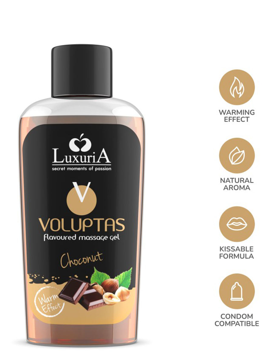 Voluptas choconut je zavodljiv i ukusan stimulativni gel sa zadivljujućim i senzualnim ukusom koji kombinuje izuzenu hidrataciju sa regenerativnim i omekšavajućim svojstvima prirodnih ekstrakata izuzetnih aromatičnih esencija. Ukusan i provokativan, savršen je za one trenutke kada želite alternativne intimne ukuse. Ovaj gel će zagolicati vašu maštu i dodati dašak ukusa tokom vaših najintimnijih susreta. Voluptas choconut gel sa efektom zagrevanja je bezbedan za upotrebu sa lateks predmetima i sex igračkama, a njegova formula garantuje potpunu kompatibilnost sa kondomima.Jestivi gelovi za masažu su specijalno formulisani, ukusni gelovi za intimne masaže. Njihova specifična formulacija znači da nežno klize po koži bez izazivanja lepljivosti. Zahvaljujući senzualnim mirisima sadržanim u ovim gelovima, intenzivan vrtlog ukusa pojačava zadovoljstvo koje se javlja tokom masaže,a takođe pogodni su i za upotrebu kao aromatizovani lubrikanti sa efektom zagrevanja.