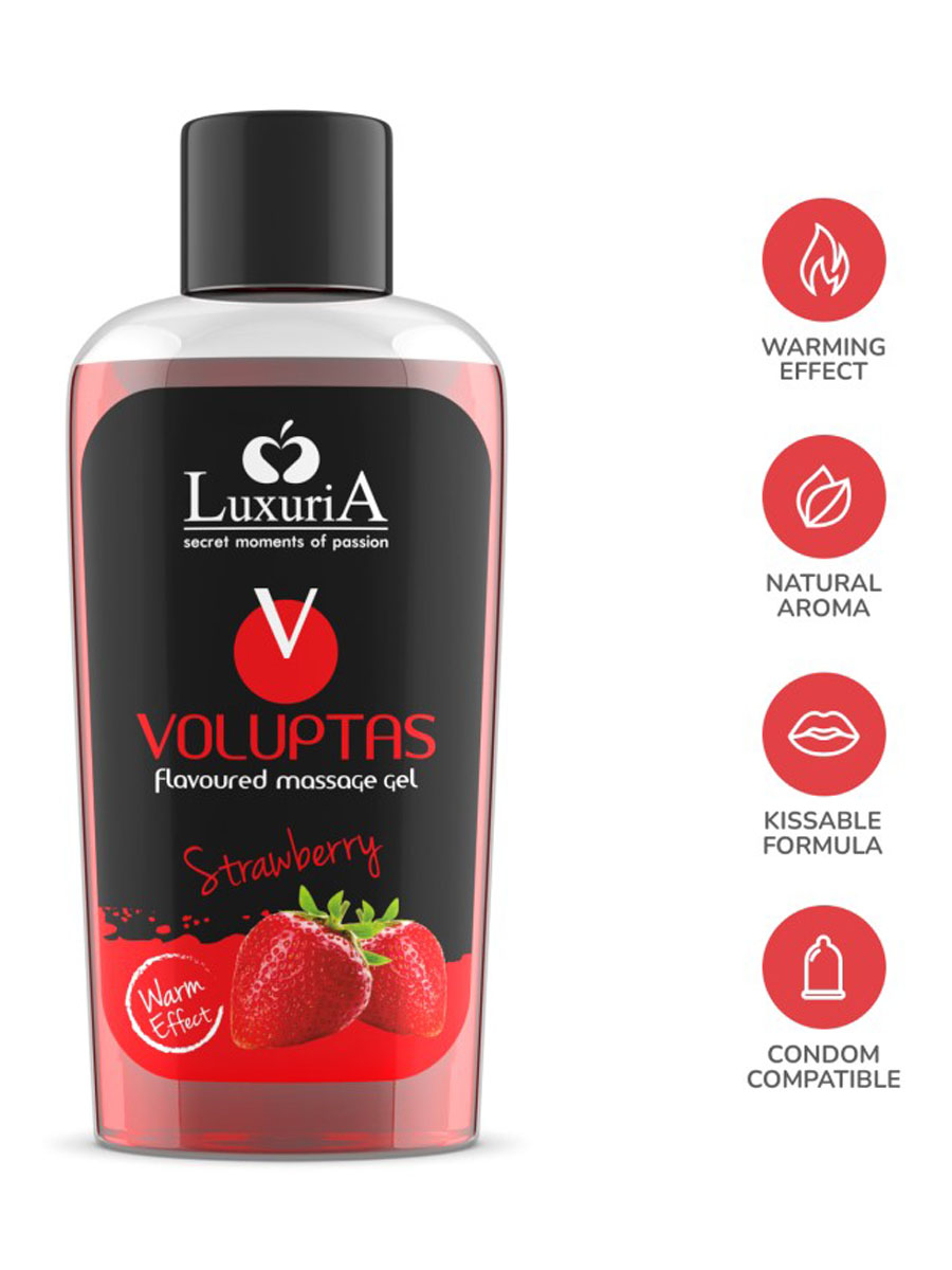 Voluptas strawberry je zavodljiv i ukusan stimulativni gel sa zadivljujućim i senzualnim ukusom koji kombinuje izuzenu hidrataciju sa regenerativnim i omekšavajućim svojstvima prirodnih ekstrakata izuzetnih aromatičnih esencija. Ukusan i provokativan, savršen je za one trenutke kada želite alternativne intimne ukuse. Ovaj gel će zagolicati vašu maštu i dodati dašak ukusa tokom vaših najintimnijih susreta. Voluptas strawberry gel sa efektom zagrevanja je bezbedan za upotrebu sa lateks predmetima i sex igračkama, a njegova formula garantuje potpunu kompatibilnost sa kondomima.Jestivi gelovi za masažu su specijalno formulisani, ukusni gelovi za intimne masaže. Njihova specifična formulacija znači da nežno klize po koži bez izazivanja lepljivosti. Zahvaljujući senzualnim mirisima sadržanim u ovim gelovima, intenzivan vrtlog ukusa pojačava zadovoljstvo koje se javlja tokom masaže,a takođe pogodni su i za upotrebu kao aromatizovani lubrikanti sa efektom zagrevanja.